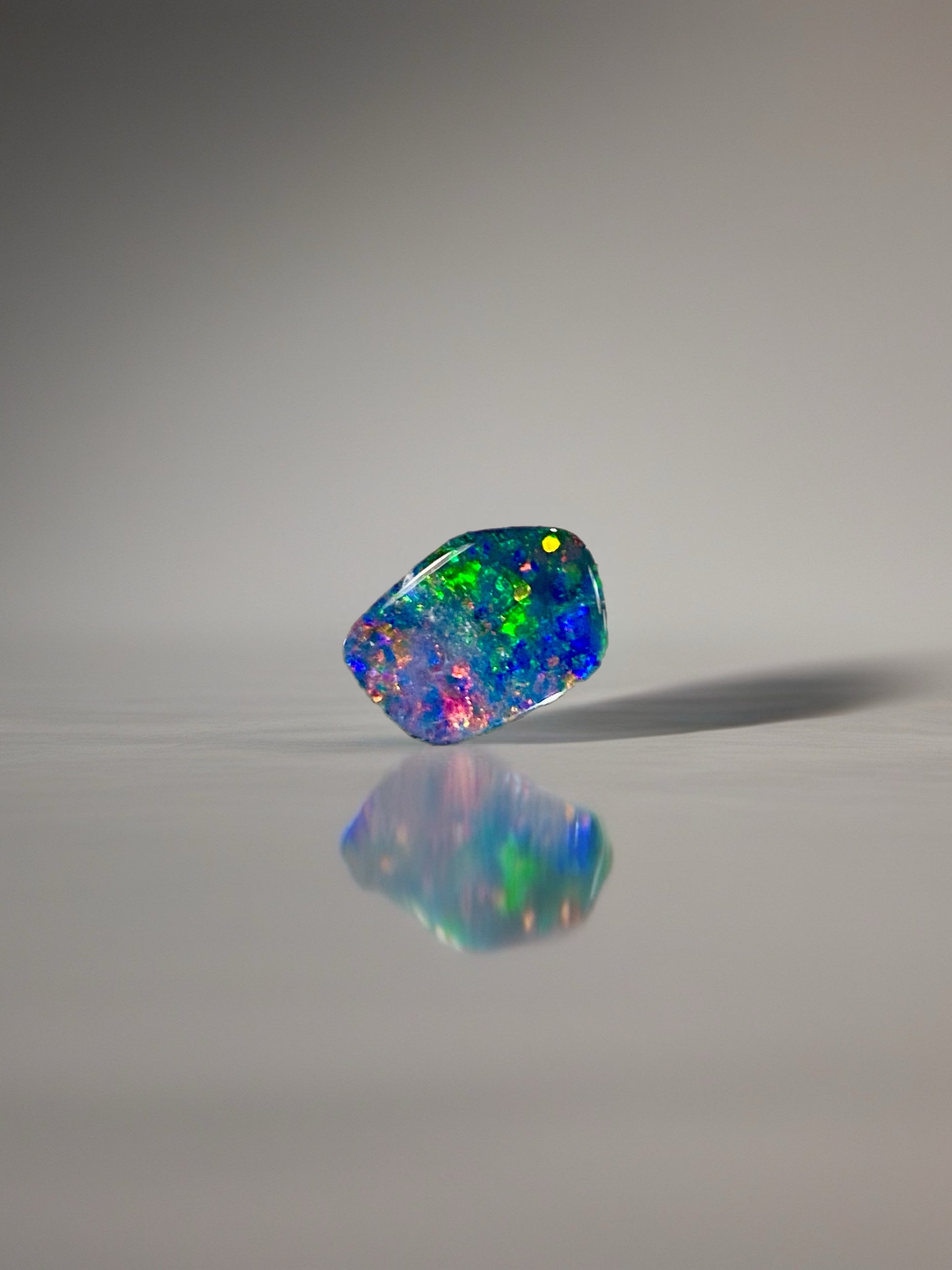 Born of Coober Pedy’s ancient earth, Chromatic Flame is a striking Australian opal doublet alive with shifting brilliance. Vivid greens and blues surge across its surface, ignited by flashes of orange, red, and gold that appear like sparks in motion. This play-of-colour is balanced by subtle undertones of violet, giving the stone a depth that feels both fiery and fluid. A bold expression of nature’s artistry, Chromatic Flame is destined to become the luminous centre of a bespoke Bramber design.