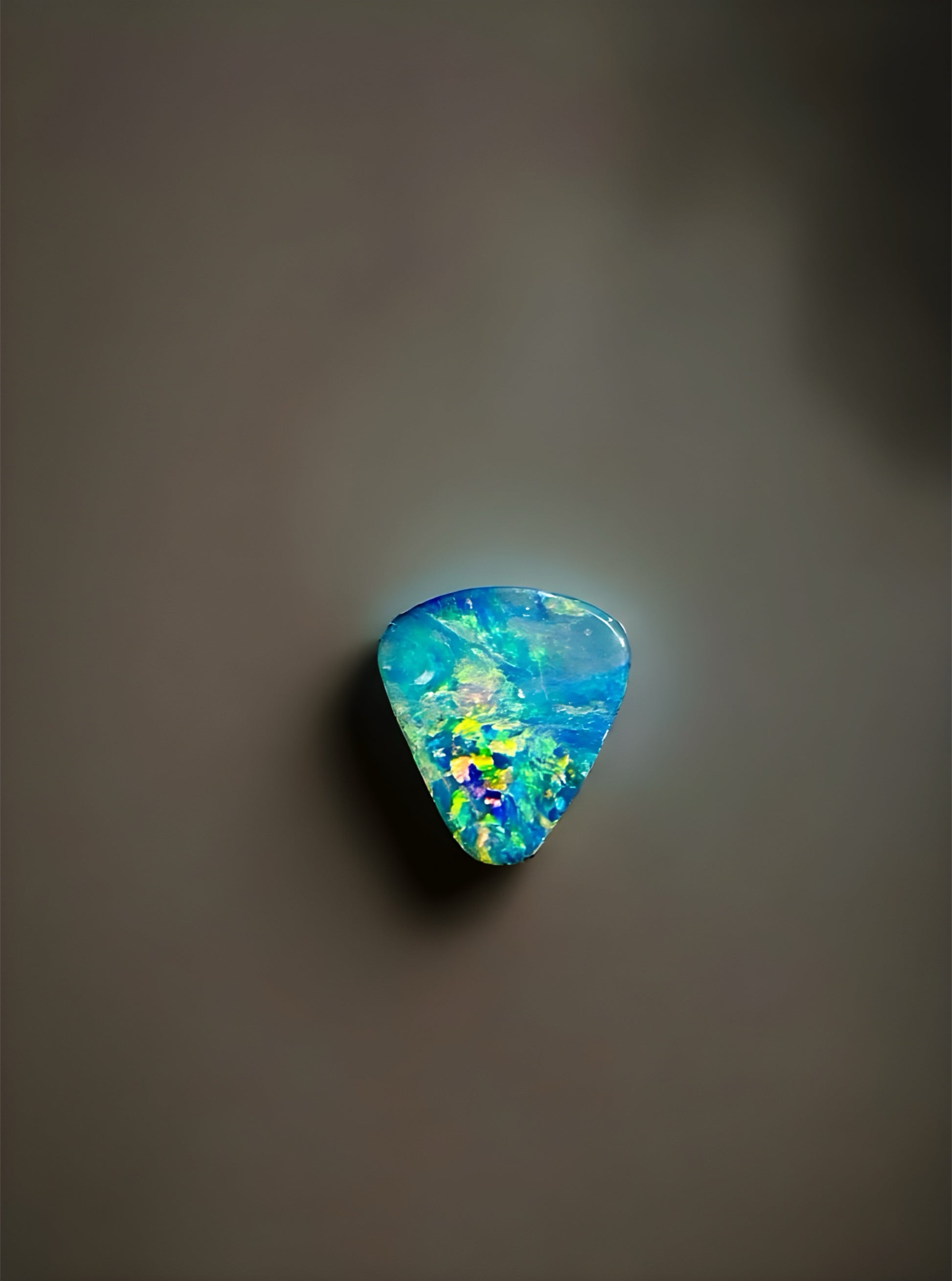 The Fretwork doublet opal, its guitar-pick silhouette hinting at playful artistry. Blues, greens, and flashes of red and gold weave across its surface in an intricate, almost musical pattern, catching light from every angle. Compact yet striking, Fretwork is a study in movement and colour - a miniature masterpiece that embodies Bramber’s ‘elegance unearthed’ ethos, ready to inspire a design as unique as the stone itself.