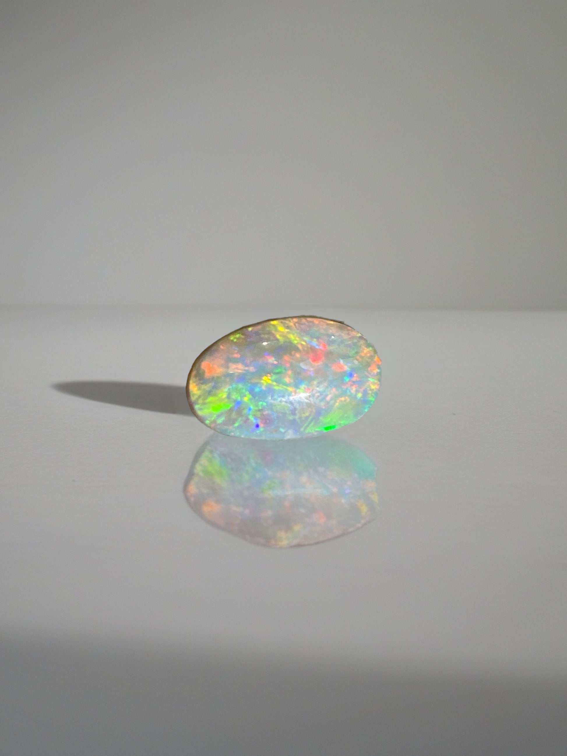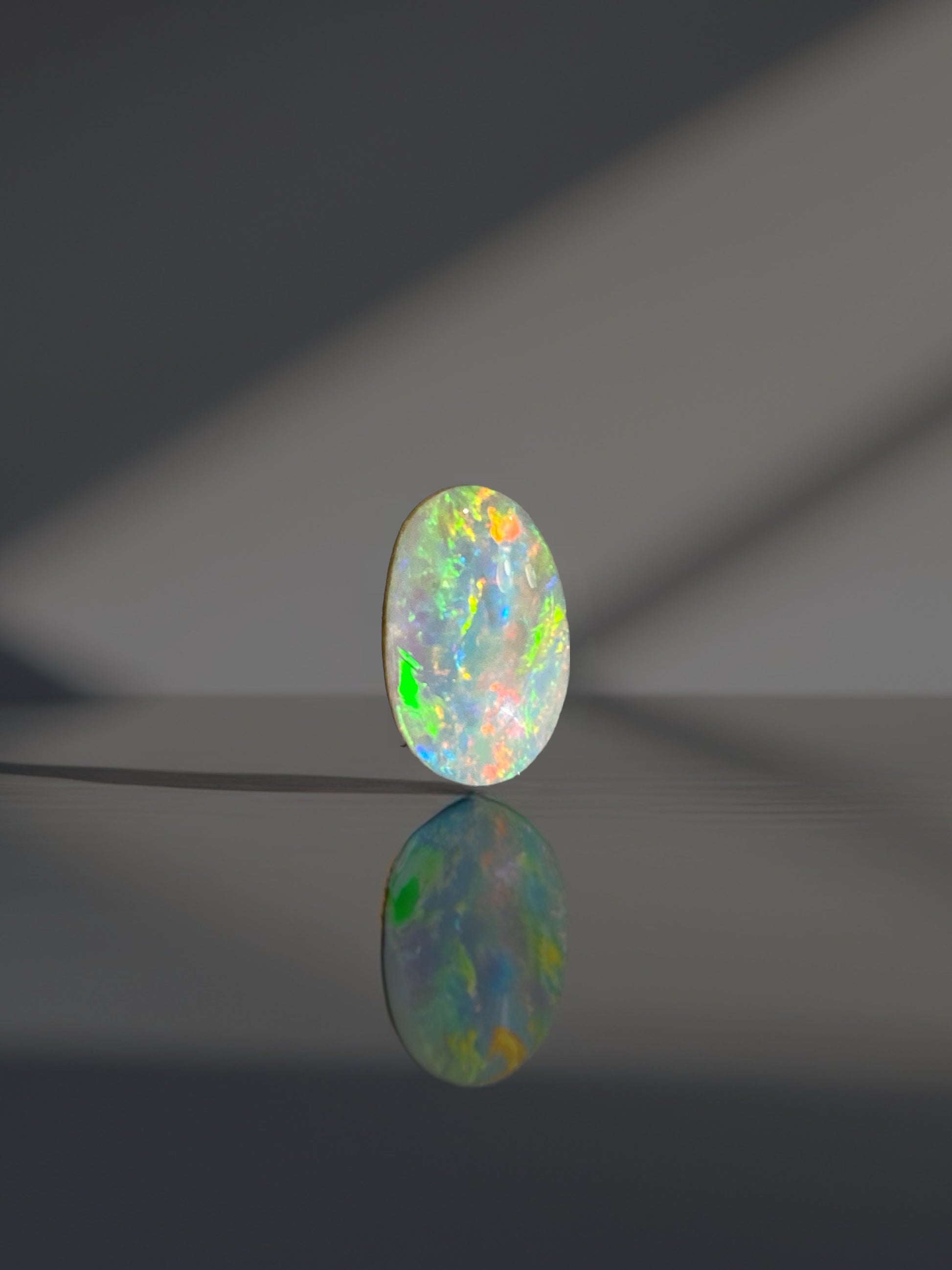 A rare treasure from Mintabie, Orionis is a 2.61 carat crystal opal that embodies Bramber’s ethos of Elegance Unearthed. Its full spectrum of colour is vivid and unrelenting, with blazing reds and oranges balanced by radiant greens, blues, and golden flashes. This opal is non-directional, revealing its brilliance from every angle, while intricate fern, broad flash, and galaxy patterns unfold like a living constellation of light. Colour runs through its entire body — front, sides, and back — ensuring strength, integrity, and a depth few stones possess.