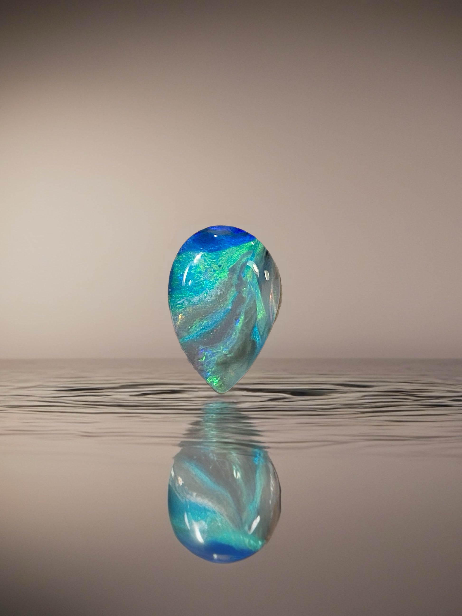 Born from the famed Mintabie fields, Three Rivers is a 3.48 carat solid opal that embodies movement and harmony. Its teardrop form becomes a canvas for vivid streams of colour — deep indigo, bright aqua, and radiant green — flowing together like rivers meeting in unity. The opal’s broad, fluid patterns evoke currents in motion, capturing the balance of power and tranquillity that defines water itself.