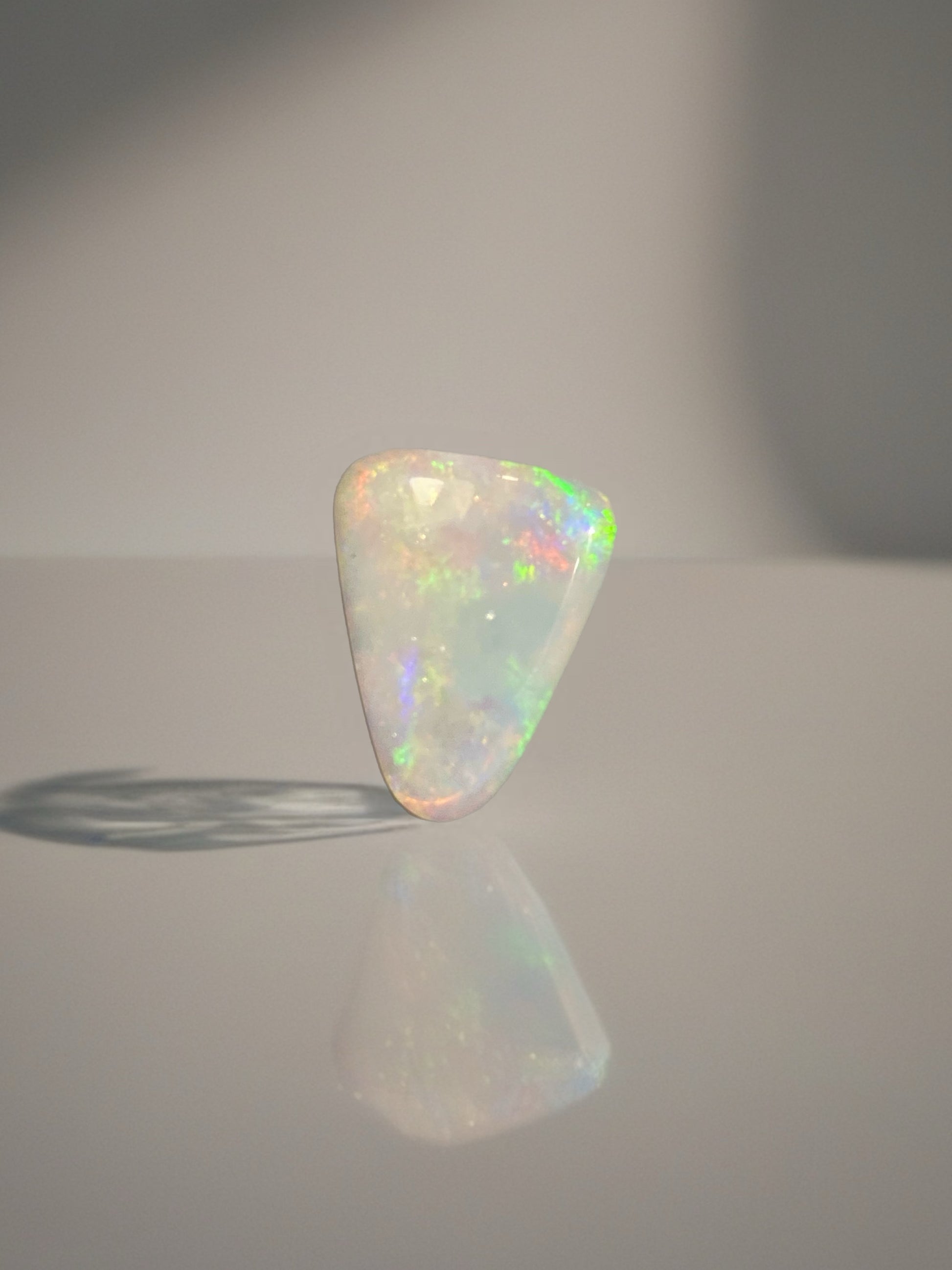 Carved into a striking tri-shield form, this solid Mintabie opal reveals a captivating rolling flash that moves fluidly across its surface. Shifting waves of colour catch the light in succession, creating a sense of motion and depth that feels alive within the stone. Its unique shape enhances the play-of-colour, giving it presence and elegance while maintaining a balanced harmony. A rare gem of character and strength, destined to become the centrepiece of a bold and refined design.